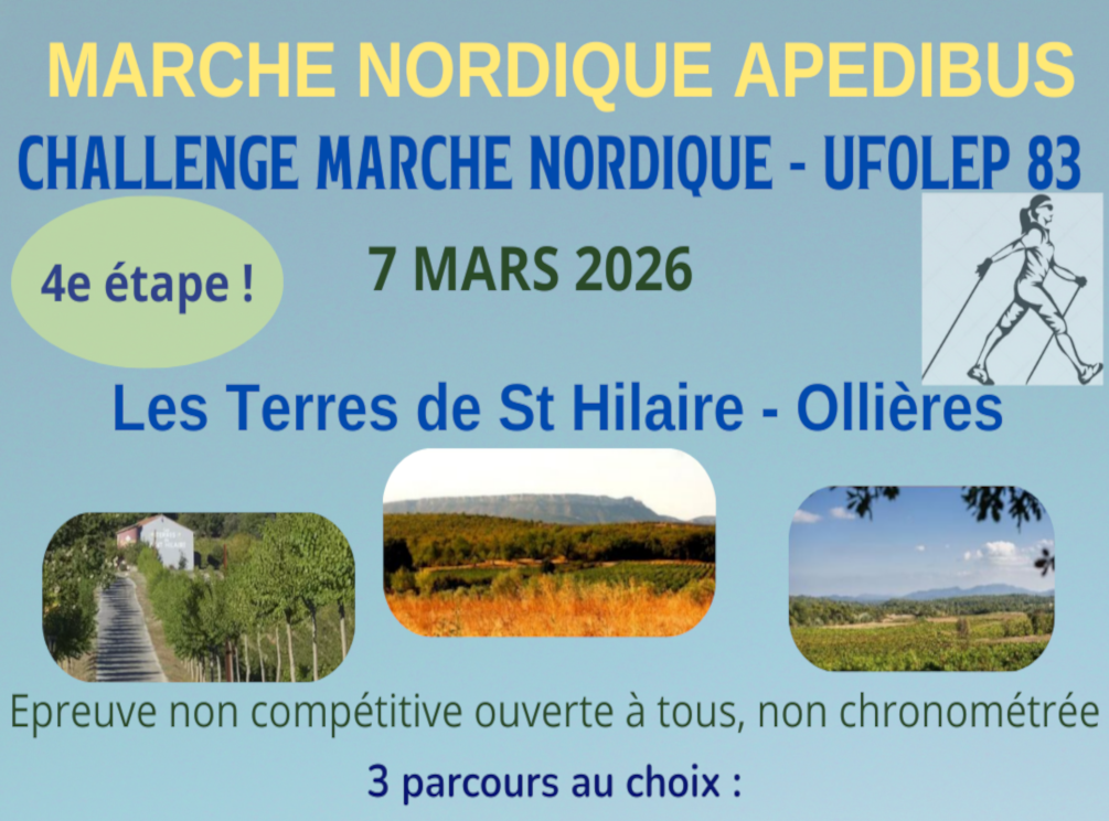 Le challenge de marche nordique, très apprécié, est reconduit pour la troisième année le samedi 7 mars 2026. Il attire près de 500 personnes sur le site des Terres de st Hilaire à Ollières. Soixante adhérents A Pedibus assurent bénévolement l’encadrement de ce challenge.