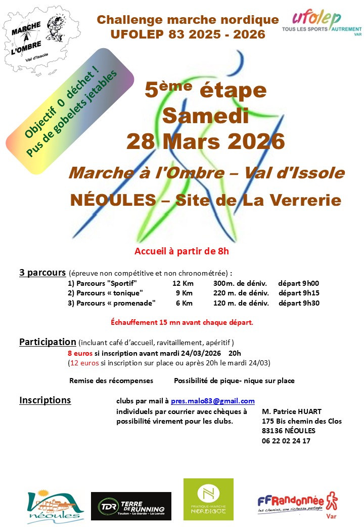 | sam.07/03 08h30 | Ollières | Challenge UFOLEP-83 Marche Nordique St Maximin 2026 | - | |||||