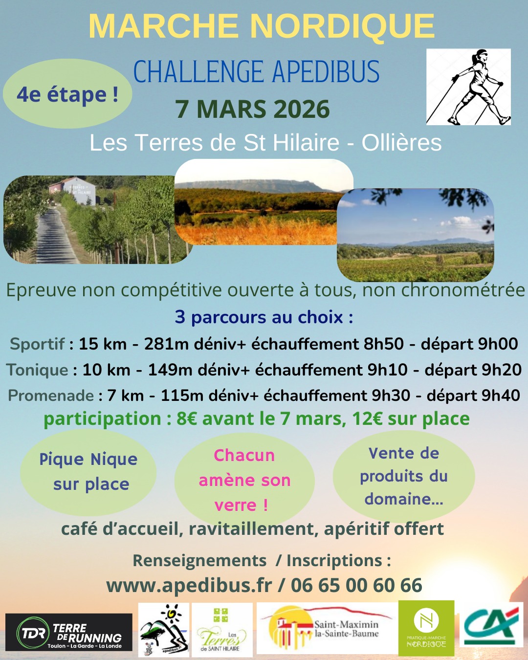 Le challenge de marche nordique, très apprécié, est reconduit pour la troisième année le samedi 7 mars 2026. Il attire près de 500 personnes sur le site des Terres de st Hilaire à Ollières. Soixante adhérents A Pedibus assurent bénévolement l’encadrement de ce challenge.